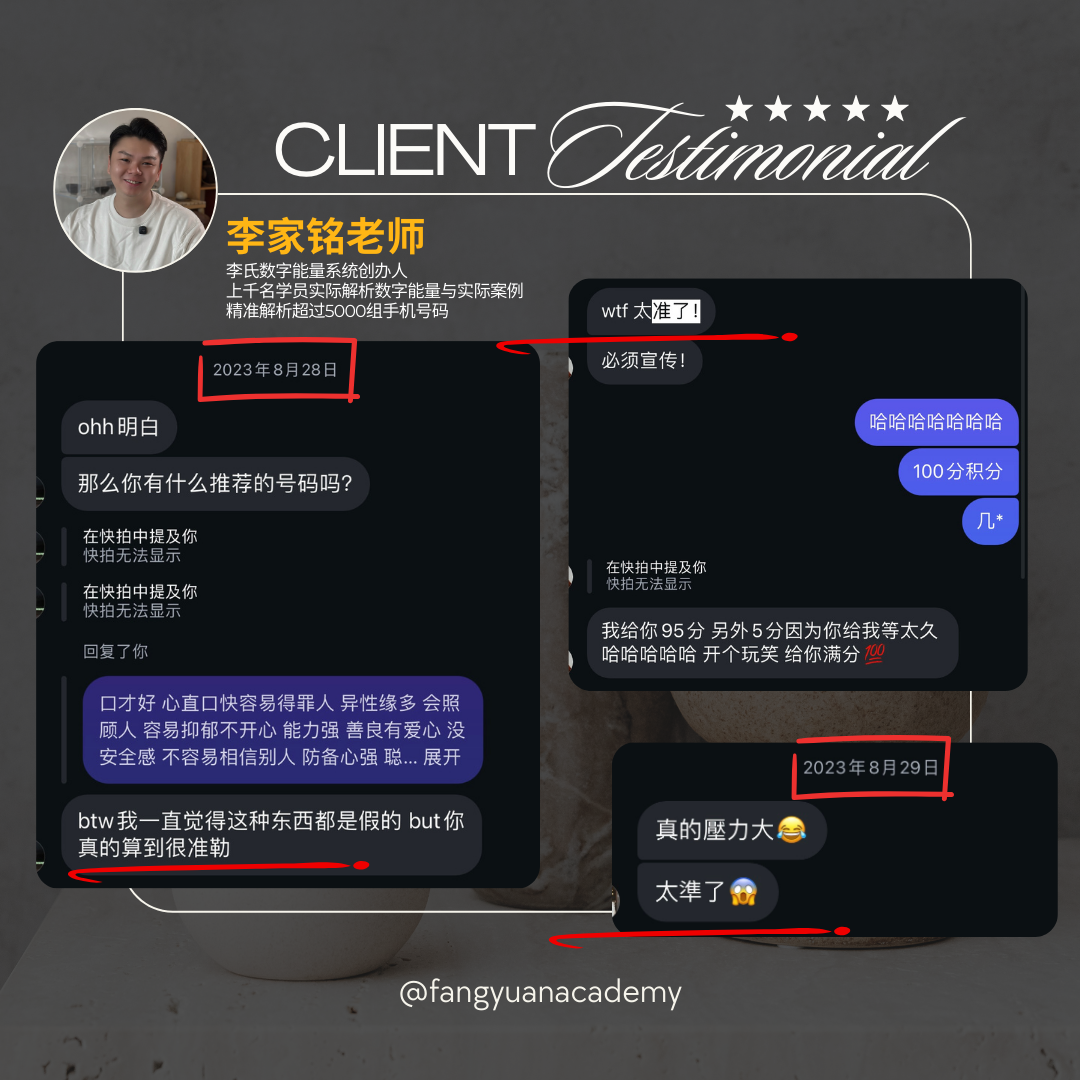 李家铭老师(李氏数字能量系统创办人)凭借超过5000组手机号码解析的经验,早在2023年就已经获得学员的一致好评,精准率高达百分百!